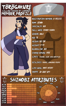 History: Kiramaru is what most people would call a prodigy or a genius. Though he doesn't believe so himself because of the small amount of chakra he has. His father, Abatos, the sole guard of Imprisonment. Abatos rarely get to see his family so, Kiramaru was raised solely by his mother, Kana. She decided that Kiramaru, being Abatos' only child and heir, should be raised in the way of the Raiden Clan, and not her own Hisui Clan's ways. Kiramaru doesn't enjoy using jutsu because his small amount of chakra and instead chose to practice his taijutsu and weapon training instead. This worked out for the best when he got his sword Furasshu from Damian Zaide.