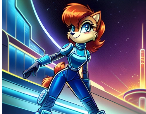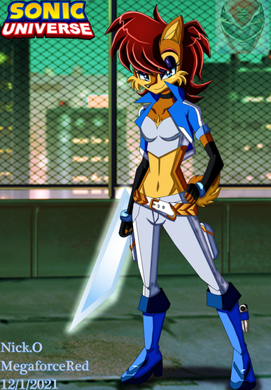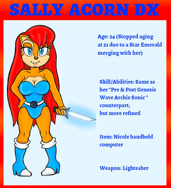 This is Sally now evolutionized to a whole new level of power. This evolutionized state of Sally was due to her most greatest creation of all time for which is called the Evolutionizer, a very powerful machine capable of evolutionized anything that steps in to the platform, the energy source will run by the exact same crystal that Nakuyu (now a Medjay) for he too was evolutionized from a crystal, also the other main power source is one of the pieces of Eden for that means anyone who gets evolutionized will have the power of Eden inside of them. Besides all that, Sally in this evolutionary state is more developed and powerful as well. Her hair, her clothes, her whole entire body changed due to the evolutionizer. As for her personality, She is more serious practically more confident and courageous than ever but still maintains her tomboyish ways and has a kind and gentle heart. Now as for power, she has her strength and power is 100 times more powerful than her original self, along with speed and stamina, not only that Sonic himself practically tested on himself and he had the same results (which he'll come soon) also she gained a new ability to get that she can see beyond of anyone else's for which is called"the eyes of the overseer"ability that allows anyone can see a mile or even hundreds of miles away. As for her weapon, she still has the Sword of Acorns on her, more refined and much more indestructible. Finally, Sally's intellect practically made her the most smartest chipmunk ever known, also one of the most powerful heroines in the world along with Wonder woman and the rest. She also vowed to make sure no one can get harmed by any of Eggman's doings ever again.I just want to start this New Year's off with a newest version of our beloved Sally herself. Please leave comments below for what you think of her, next week Sonic himself he's going to be evolutionized to the max.