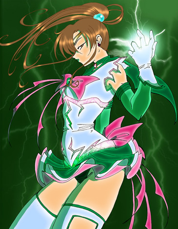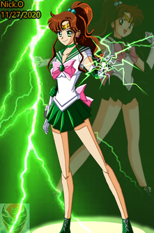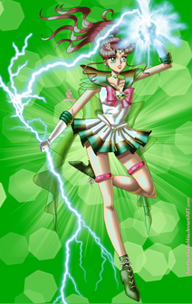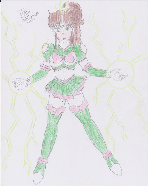 This is Sally's true Sailor form, Sailor Plasma. In this newly-developed Sailor form, Plasma has the of ability of fire and lightning. She can also power up a full charge and fires off lightning bolt projectiles at her enemies. She can breathes green fire that immensely incinerate anything in its path. Also, She moves super fast as lightning itself that her opponents can't keep up with her. Even, She can generates a green electric aura that is similar to the legendary super saiyan 2 aura protects her from any attack. As her emotions, She's very serious and known to very brutal at opponents. But with friends, She maintains her kind-hearted and well-respected nature. She also very protective of her friends at many means possible. Alongside of that, Plasma is extremely powerful with tremendous strength that give her the title " The Almighty Green Thunder". Plus, Plasma possess a green saber called the Plasma Saber, A weapon that can slash through anything including heavy metallic armor. Lastly, She has an Ultimate Finisher that will finish a battle in a less than a minute, called "Shining Plasma Grand Slash" that will her enemies in their place. Her Animal is the Green Plasma Shark that assist her at with any obstacle that she faces.Related content