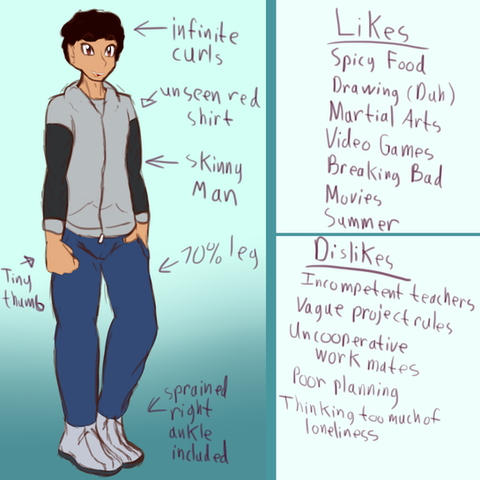 An anxious and short-tempered guy. For the most part he enjoys being alone, or at least keeping his space. Often times heβs either reading or gaming. Behind his moody demeanor, is a sentimental boy. He deeply loves people he's close to, he just prefers not to show it