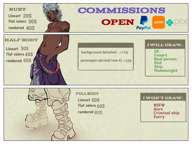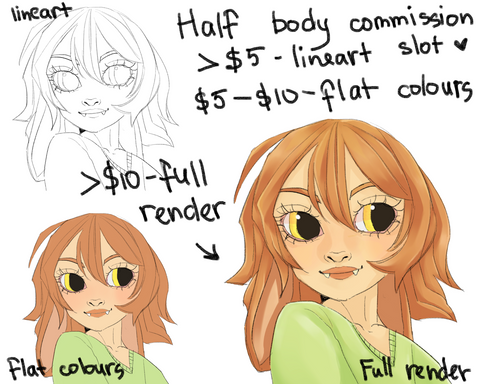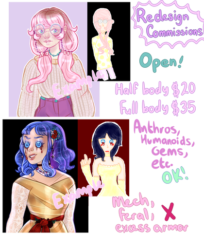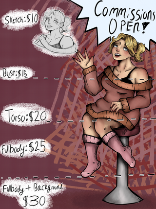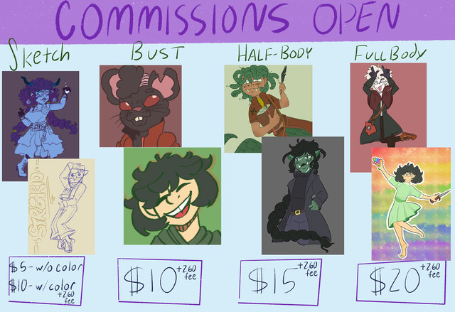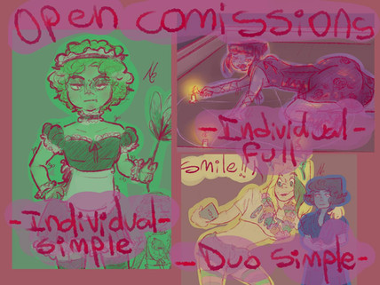 I’m opening commissions here to hopefully earn enough to help with bills around the house. My stepdad just had heart surgery recently and isn’t cleared for work for another month. And my husband just lost his job so my income is the only one coming into the house. I don’t even make enough per month to pay rent and electric. So please, if you’d like to help you can commission me to do a character design for you or draw one of your OCs if you’d wish. Please refrain from making it NSFW.