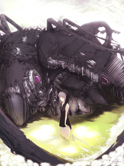Gah... how do you do this... D: .... why is everything you do, so, so perfect? Meh... There are birdies on the mech's head~ The water is really nice... however... I am noticing a line thing in the background that looks kinda like a fold in paper? What is that? I love the dirt and lighting on the grass and the lighting in general!