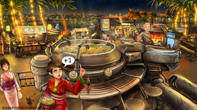 i love scenes like this, mecha in a casual environment. the juxtaposition is perfect. great work!