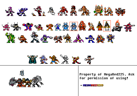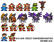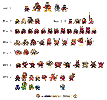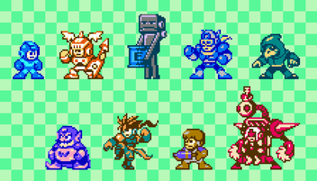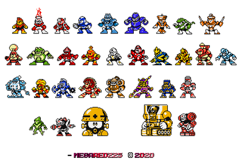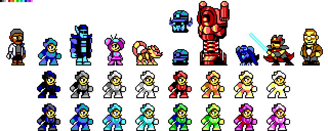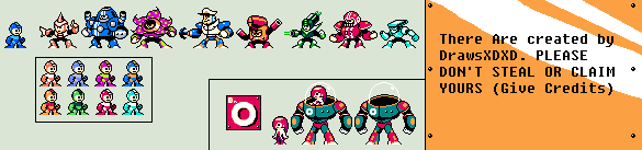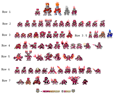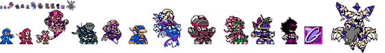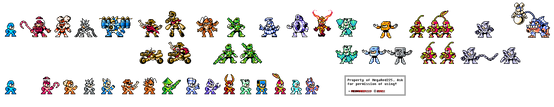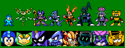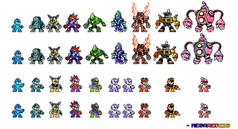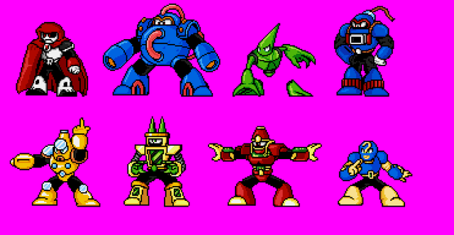 This is a request for I've taken yesterday.These are his Robot Master OCs (from left to right): Temperature Man, Groove Man, Pole Man, Mire Man, Flush Woman, Moth Man, Rush Man & Purity Man. I especially enjoyed spriting Temp. Man, Pole Man, Flush Woman & Rush Man. Before you may ask; Flush is in terms of the card game/poker ♣, Rush Man isn't an anthropomorphic form of Rush (Mega Man's Dog based assistant) but rather an electric robot, and Purity Man is a cleaning robot.