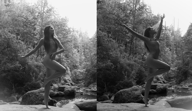 WoW What a location! Fantastic in b/w photo. Love that i can see your pretty face & sexy long legs here. How in the world did you & Dakini get on this rock & was it steep ??