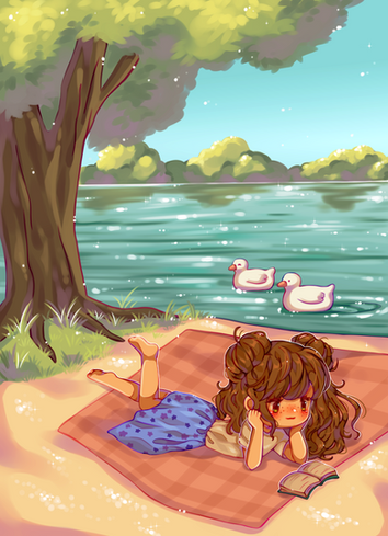 #birds #characterart #characterdesign #cute #garden #girl #picnic #reading #summer #sunny #booklover #visdev #birthdaygift #curlyhair #curlyhairgirl #digitalart #digitalpainting #idyllic #visualdevelopment
