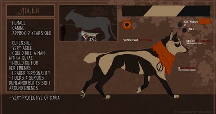 Physical and psychical traits: Nera has a typical GSD anatomy, which means her back and hips are not completely healthy. She has occasional hip and back pains and it makes her life harder. She is slim but has muscles. She is really agile and fast. Her body is covered in scars that she has gotten from street life and fighting. She also has a panic attack disorder which can be triggered in various situations. Usually when attack hits her she wants to get away from everyone. She thinks it's a big flaw and she doesn't want to be seen as weak.