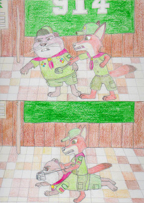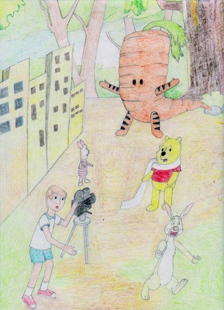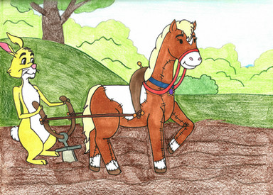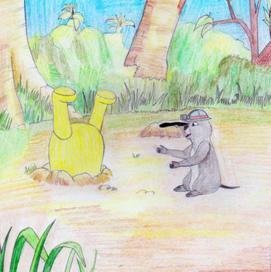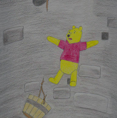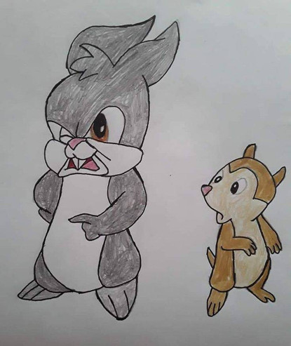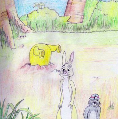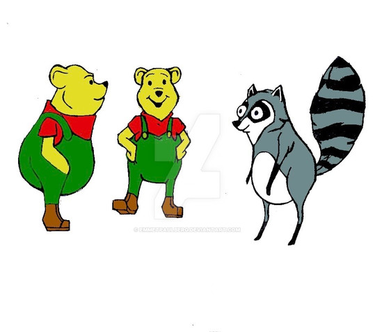 Seeking Gopher's aid with the Heffalumps and Woozles running amok, Rabbit comes up from behind him only to startle him. While reacting to the surprise Gopher jumped up on top of Pooh who was stuck in a hole.