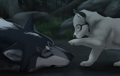 The clan's land was quiet, harboring the pack in relative silence. The occasional yaps from pups or soft murmurs of watchful guards drifted on the breeze. Near a secluded grotto, sat a young adult wolf, pondering the leaves as they blew. Sunlight filtered through them, and every moment of the foliage brought the wolf deeper into thought.'Thousands of them.' He thought, watching one snap off and hazily fall to the ground nearby. 'So many yet all of one being..' His thought was interrupted by a small bump to his flank, and he looked down at what caused it.
