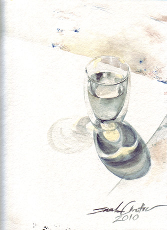 Second tip: take a piece of scrap paper - SEVERAL pieces of scrap paper, if you can afford it - and just try every combination of water and paint that you can think of; water first, paint and water together, pouring, masking, heavily loaded brush on dry paper, heavily loaded brush on damp paper, lightly loaded brush on damp paper, tip of the brush, layers of color along the brush, running a damp brush over color you've already put down, pressing something hard into the paper before and after laying paint down, dropping water or salt onto paint that's half dry... anything, just so you know what the paint will do if you try something. You can't control watercolor, really, but you can predict it.