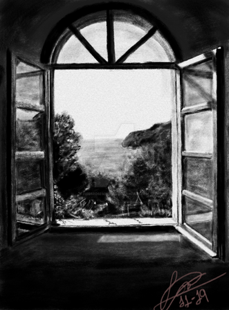 I see what you mean, but if you hadn't mentioned it as a mistake I wouldn't have thought it WAS one... Love the shading of the wall and the outside. Mebbe add a little more blue to the center of the pic? It's the one thing that takes away from the realism of the sky. (fave)
