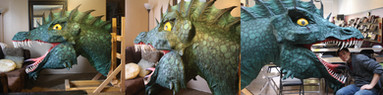 This is Rupert! He is a dragon puppet made from vinyl and felt. His teeth are plastic "Pumpkin teeth." His eyes were drawn with colored pencils and covered with glass cabochons. He is going to perform in a YouTube video for someone. Not sure when. (I'll share a link when he makes his debut.)