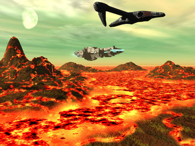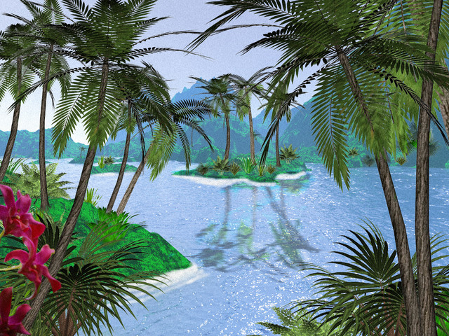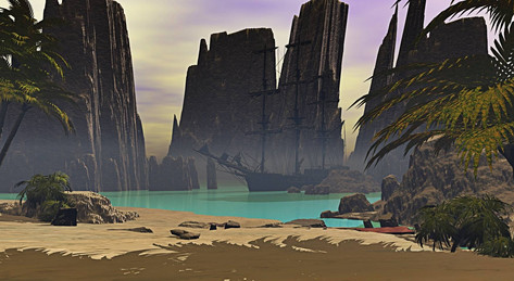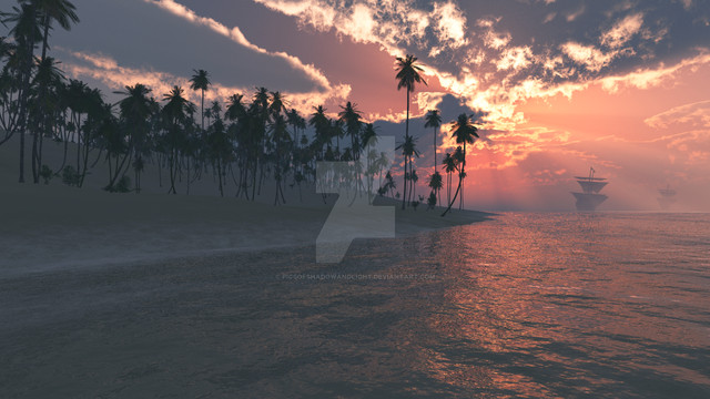 3D scene in Vue d'Esprit of two pirate ships passing a small tropical island in bright daylight, the sky is fully illuminated by the noon sun, a coloured butterfly advancing in the foreground.Related content