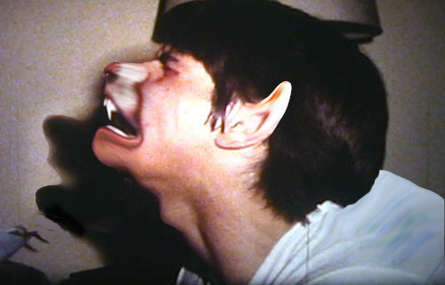 Who says it's not true?An altered photo of me turning into a werewolf, (I gotta stop posting werewolf stuff...). I took a photo and added a morph effect in gimp. I meant to post it a while ago, but I never quite finished it. Recently though, I added some detail and blurred and distorted the photo to make it look less obviously altered. I'll post a "making of" picture later. Enjoy!