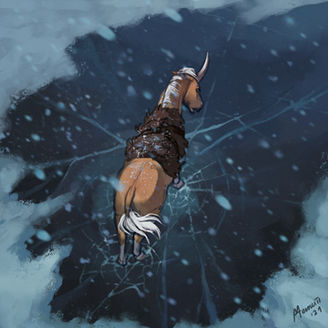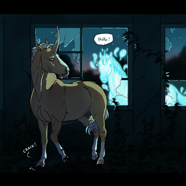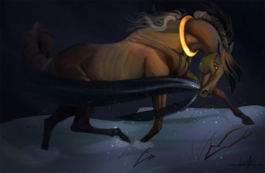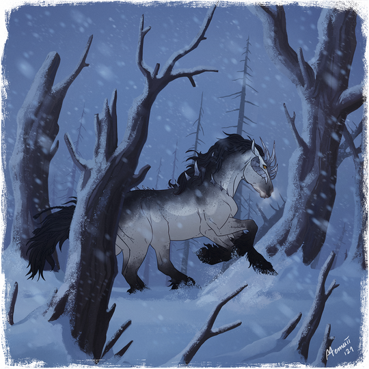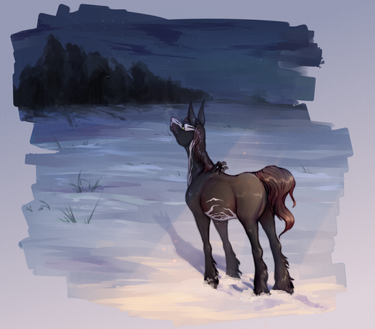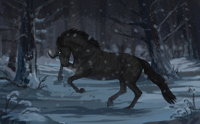 From the first moment Solstice saw the strange deer-like unicorn, she started to chase him around fearlessly. She was always reckless at heart and when she felt magic in the air (and there was indeed something magical about him) her legs moved on her own. At first, he doesn't seem to notice her and even if he did, he ignored her completely. It was a fun game, following him around, it kept her occupied during the cold winter days.