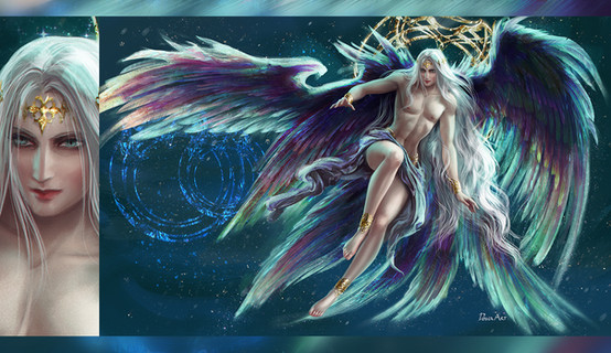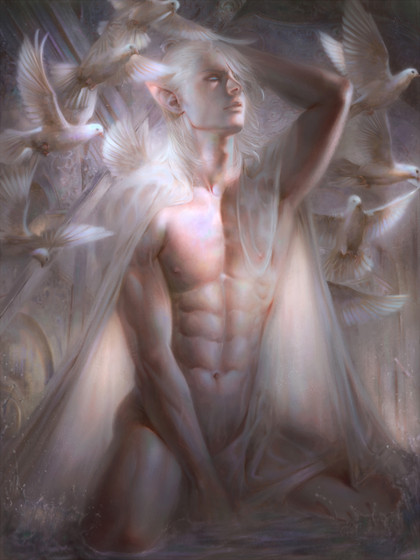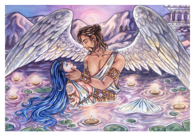 #bath #black #blackeyed #blackhair #cloak #demon #dress #entity #eyes #gold #man #pool #reflection #water #white #wings #woman #digitalart #fantasy #flowercrown #headdress #longhair #longhairedmale #painting #shimmering #shirtless #whitehair #longhairgirl #whitehairgirl