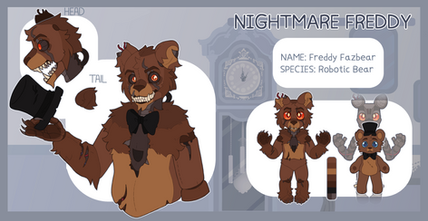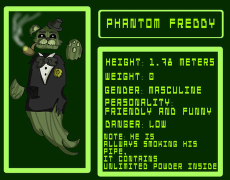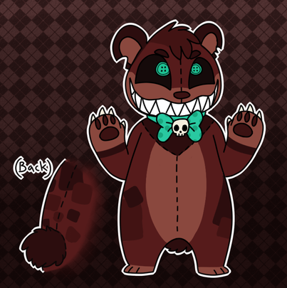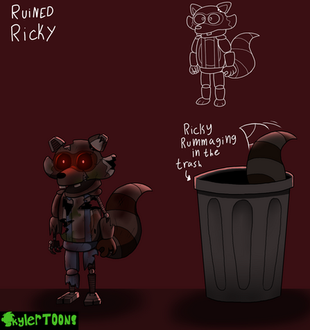 History: Ricky was originally going to be the main antagonist of the Freddy Fazbear show(?). His role was a greedy robber that would try to steal all the characters' pizza, and it was the main trio's (Freddy, Chica, and Bonnie) job to stop him and teach him to be good. Unfortunately, Ricky was replaced with Foxy, as a pirate antagonist was more appealing to the children audience than a robber. They did not get rid of Ricky though, rather they just put him in a backstage closet (which is hidden to the camera) where he was to stay and collect dust.