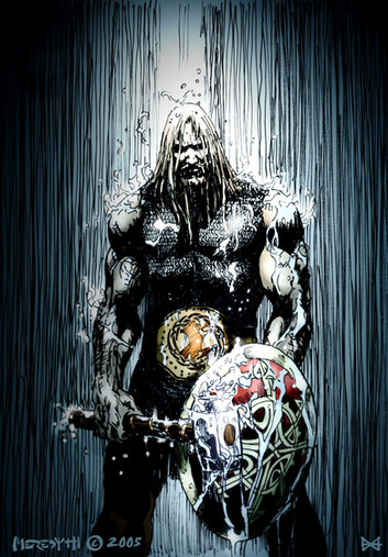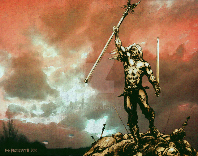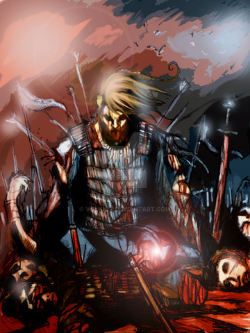 Update: I was not quite satisfied with the colours and background quality, so I got to work on it again. I added a lot shading and detail to the sky, added some texture and gave it a more sombre, worn look. I like it much better now; I hope you do, too.Pencil and ink drawing, loosely based on a sketch after a comics cover; photo manipulation on background, digital colouring using corel software.