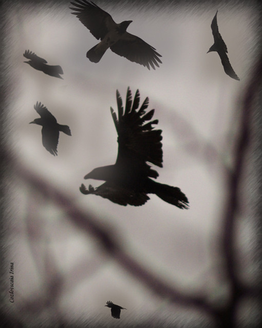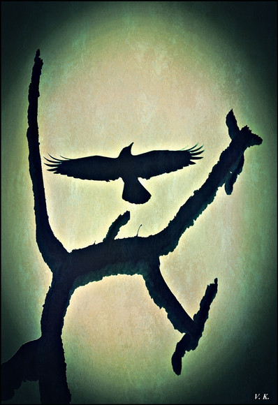 A green sky similar to that, at least in midwest USA, usually means weather ripe for a tornado and in fact can mean one has brewed nearby. So when I look at this I'm reminded of the ominous stages of spring when the warm air rolls in from the south. I see a story there with the raven circling in anticipation of what that weather could leave behind, and the other perhaps older and wiser waiting more patiently behind. Excellent eye flow as well! Love the way the branches add to that. digital cheating? nah.. just another tool to help portray the look that the artist wants to achieve. :0)