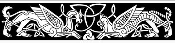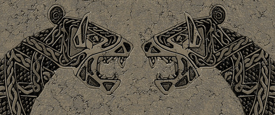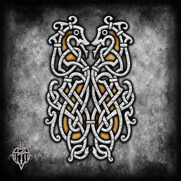 Based on original Germanic art from the Migration Era, Merovingian and Vendel Age. These birds often are depicted on brooches and shield ornaments. Contrary to popular belief these are not ravens but most propably eagles, hawks, or falcons, as can be seen by their curved beaks. Although Germanic and later Viking age art styles are heavily ornamentalized, later Viking Age birds usually sport straight beaks like ravens do. In the times preceding the Viking Age, Odin/Woden more often is depicted with different birds, and the eagle like the wolf and the raven is one of his animal companions.