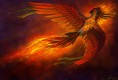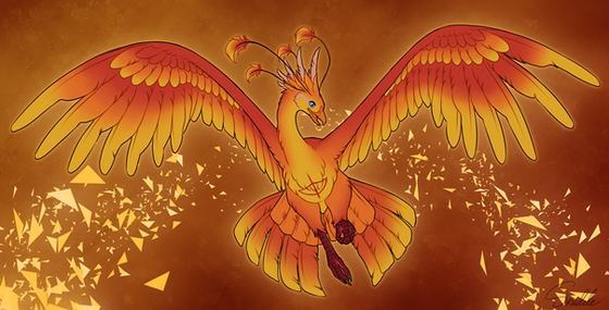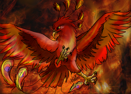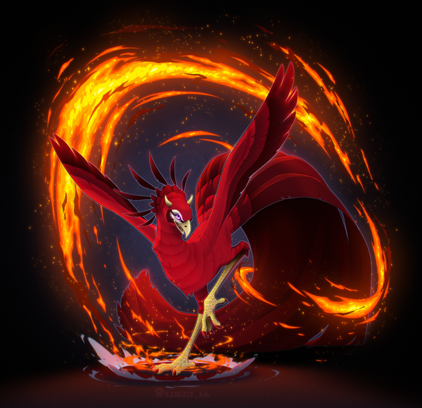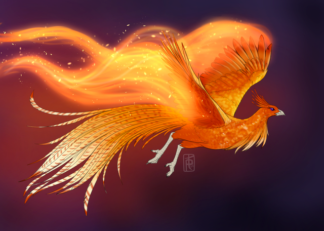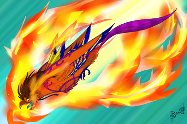 Naprawdę śliczna perspektywa i kształt skrzydeł. No i ta emocja na pysku! A tło wygląda jak płonący las. <3