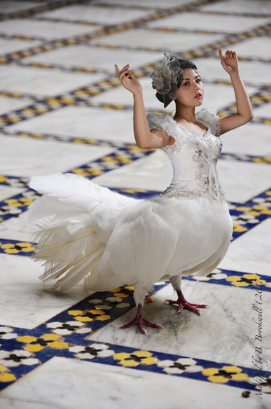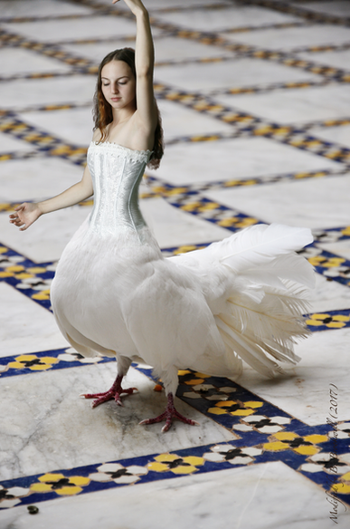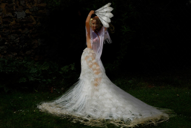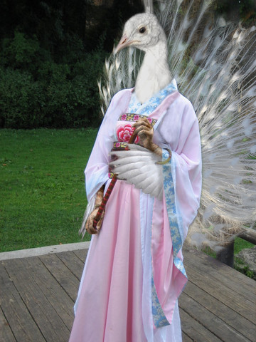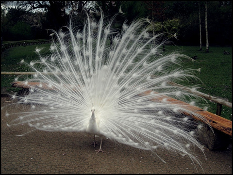 The fundamental flaw with this photograph isn't the white feathers, those occur among tamed peacocks. What is wrong is the big tail - that is for peacocks not peahen...