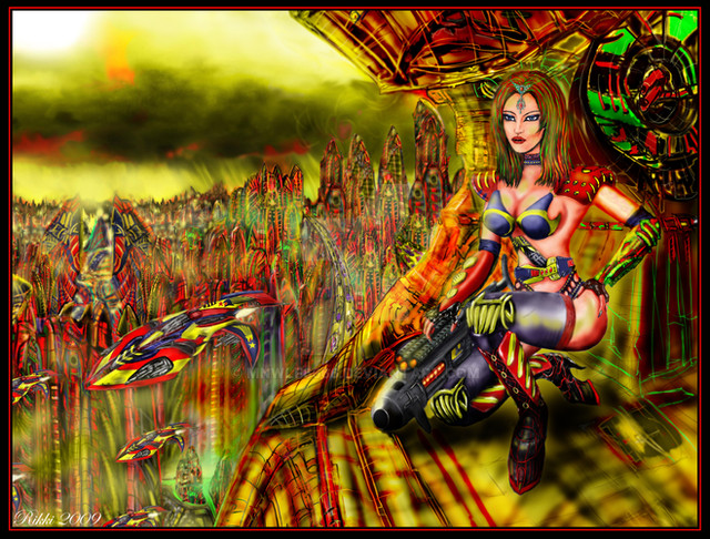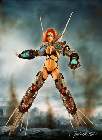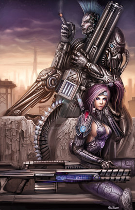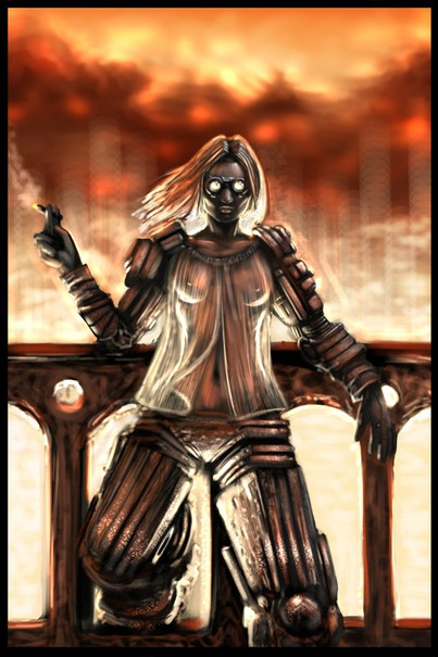 The shading on the metal is absolutely brilliant here -- well done. I love the juxtaposition between the girl and the ... man? droid? -- she's so soft and looks almost vulnerable, despite her tough expression, whereas he's most definitely hard as very old boots. And I don't think the background's bad at all, especially as it vanishes into the distance between the two; it looks very futuristic-neon-city. Nicely done.