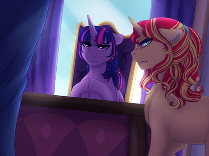 At the cusp of noon, Sunset Shimmer stood in one of the many crystalline hallways of Twilight's castle. Her hoof's ginger tapping against the wood of the door before her seemed to reverberate through the quiet, empty corridor.