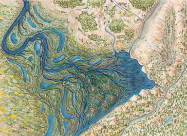 The lower right-hand corner of the image (really, that whole landform) looks great, and, I think that this is in no small part due to the dearth of thick, dark marker strokes there. You do a great job implying the topographical contours of the mountains, and I love the shading—perfectly executed.