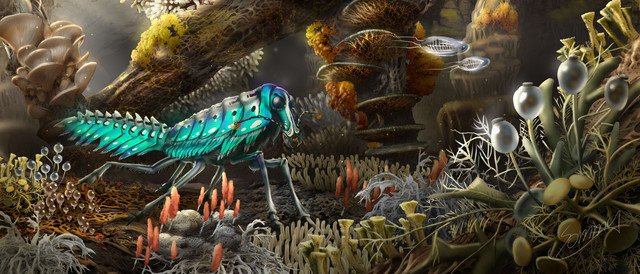 While I can see that some of the organisms looks poisonous with their bright colors and that the megamyriapod is huge, I donΒ΄t see what sorts of terrifying beasts could dwell in this botanical beauty.