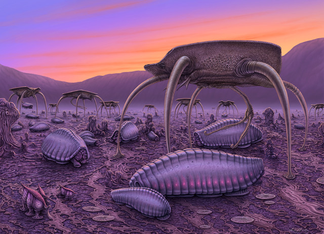 This is the native habitat of the megamyriapod (at center) featured in a previous monochromatic work. This slow-moving, placid beast is about twenty feet tall and feeds primarily on the purple wave carpet organism that is spread across the floor of this scene- gathering it up with its anterior grasping appendages (at left). Other creatures lurk here, including the greenish motile floating feather duster gourds, the yellow/teal walking platter life-forms, and the purple pilantir balls. Growing around and above these smaller living things are the gargantuan lineated gold air-sponges - the megaflora that constitute the main physical features in this environment. All these creatures obtain energy from a combination of photosynthesis and physical consumption of soil nutrients or living tissue. Basically, the strict division of heterotroph/autotroph (plant/animal) that is exhibited by Earth-life simply does not apply here. Rather there is a gradient between those creatures who gain energy exclusively from light, and those who must consume others to survive. The majority of creatures here utilize both approaches.Related content