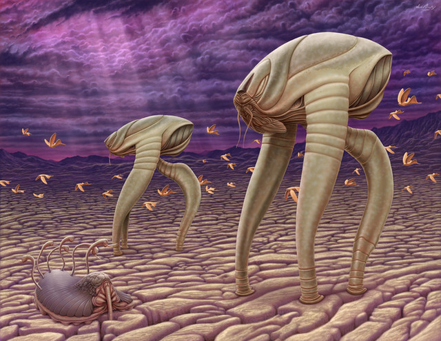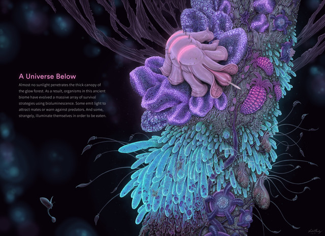 Wow, there's so much about this that's utterly mind-blowing. I love how you incorporate botanical and abstract elements into your creatures to create an almost anti-human aesthetic--why should nature care what we find cute or appealing after all--yet you still throw us humans a bone with your extremely appealing/intimidating command of color, composition, and lighting. I particularly like the crinoid-like walkers and the floaters with the feathery propulsive flaps (here are a few articles on floaters if you're interested in the strictly real-world mechanics of them: [link] [link] ). The pink worm is pretty funky too.