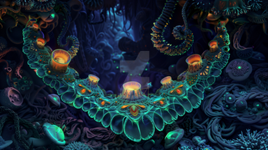 Of all pictures in your gallery, this one must be the best one. Here, your skills in design and shading is really showing off; the scene looks so alive with the light rays, depth and texture. Just like AmnioticOef said, this non-human, abstract sense of beauty is what makes your gallery really fun to look at. It makes one want to explore more and if I would have a vacation in an imaginary land, it would be this place and the world of Codex Seraphinianus. Excellent piece of art!