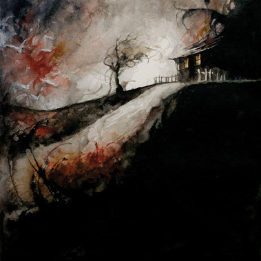 This is amazing, there is so much to this picture. I like the touches of red: red figure in the foreground, the single red window of the house, the red horizon. And what are those rocks/ruins on the mysterious hills in the distance? It all creates a really eerie atmosphere.