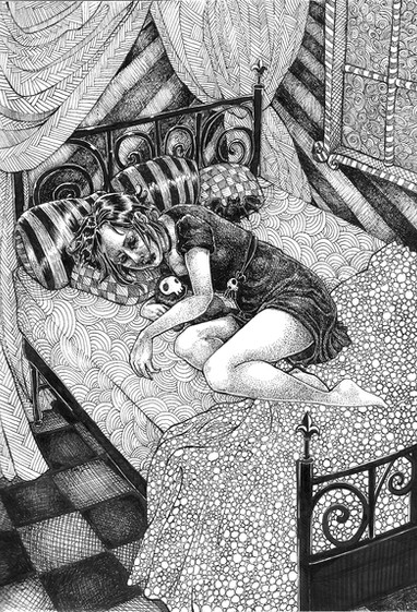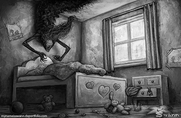 A commission for a poetry anthology. This is the illustration of a poem titled "Nighttime Creatures", about childhood terrors.Ink on paper (21cm x 29,7cm)