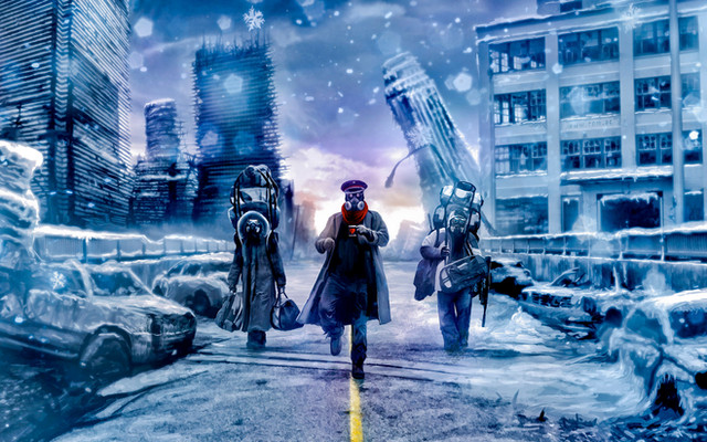 Heh, here's the little story I got from looking at this: A war has just ended, leaving the residents of this city to resume their lives. Because of the ash and bitter cold, most left. A fraction of the people who stayed saw this as an opportunity to make a quick buck (especially since technology is already leaping forward, so some of the things left behind are quickly becoming valuable relics). Every day, these mercenaries sweep the city, collecting anything likely they could sell or use.
