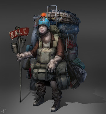 Let's see. The scene probably depicts a futuristic setting (judging by the nature of the buildings), but at the same time poverty and harshness of life is also present - a cruel weather, and the constructions don't seem especially well ventilated. The cigarette that the foreground figure smokes points to the low living standards, his build and the weight he carries on his back suggest a hard working person, and the number of satchels he attaches to his clothes make it clear that this man is not doing this job for the day, but rather has been doing it for a long time and is quite efficient at it. Another point to notice here is the number of people present in the background, all of which seem to be doing the same thing. My best guess is that this man right here is a lost astronaut, maybe after a mission gone awfully wrong he found himself in this harsh planet, and with no clear way out of this trouble he decided to switch jobs, and be more useful as a human carrier - a job well paid since goods are hard to transfer by vehicles on this icy ground, and no other life forms are up to the challenge.