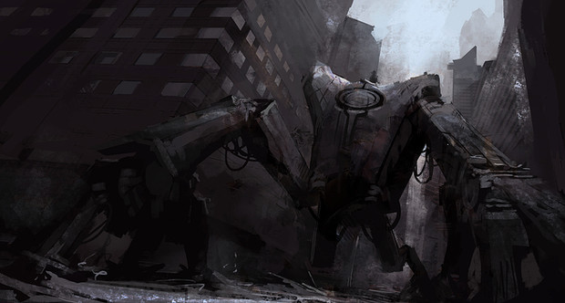 I love the overall scene and possible stories that could go along with it. Not a fan of the drone's "face", but it's bulky and mechanical seeming design goes very well along with the landscape.