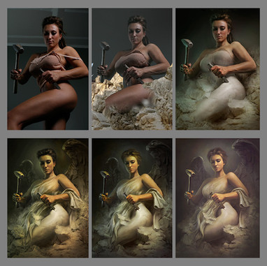 I like the improvements, you're correct that to porportions needed to be fixed however the hair and the expression on the woman I'm not so sure were needed to be changed. To me the woman on the right looks like a beautiful model someone put wings behind. The woman on the left looks like she's got a background, a history and she's on a mission. AS if she is not molding herself but freeing herself, being released to go out and do some bizness and save some damned souls! The woman on the right just looks like she's posing for a picture and could even be sculpting herself out of vanity rather than a purpose. But that's what I get and we all know, art is about interpretation.