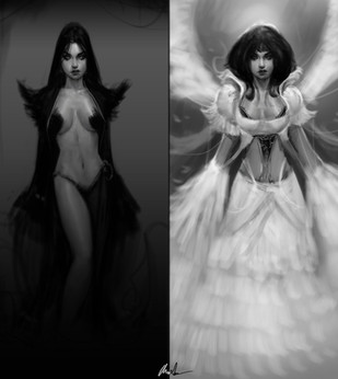 The short-haired angel has a fiercer look to her, as if she is a warrior angel, while the other woman is softer. Β But with them side-by side, I see the wonky proportions on the left you were referring to.