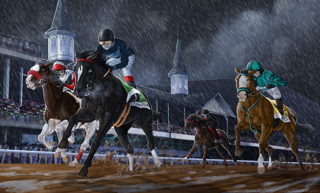 This piece was inspired by the image Iron Curtain [link] I did a few weeks ago. I still love the classical arts (and oil paintings of horse racing have always intrigued me) but I always felt that art is best displayed as something that cannot be seen in the real world. There should be some element of fiction and fantasy that needs more than a camera to be recreated.