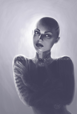 Apparently, in the future, when all races have combined everyone will have red hair, medium skin tone, and Asian eyes. I don't think red hair would have worked too well for this image so I shaved herThe model for this image (Maria), living in Hong Kong but from Russian Siberia, struck me as the kind of person who is a survivor, so a futuristic image works well for her.