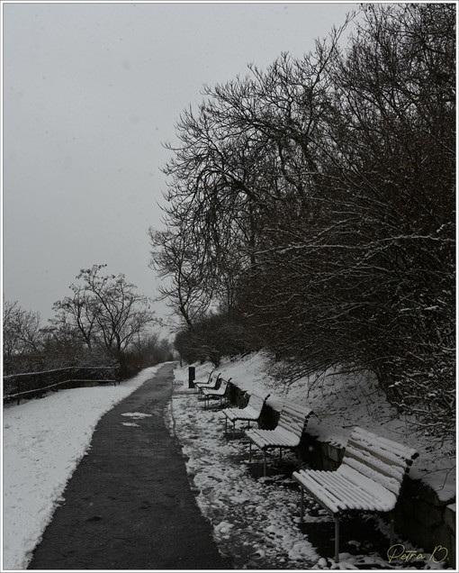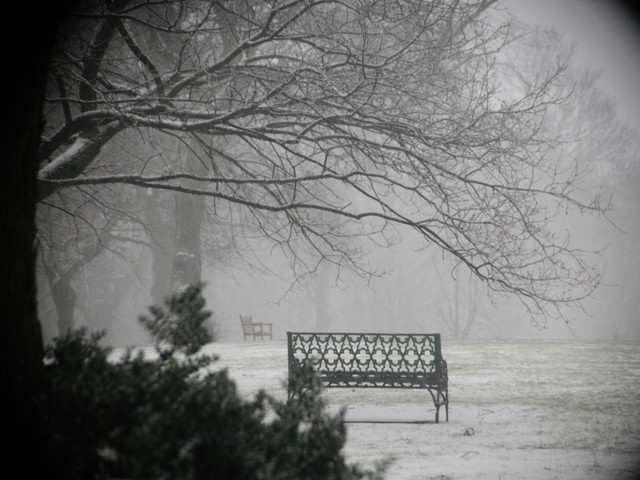 je voudrait etre sur ce banc, a regarder la neige et a laisser mes pensées voler librement