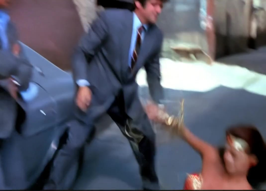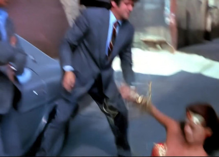 Wonder Woman then quicly throws her lasso and wraps it around Theo. She then yells, "Theo, the robotic terrorist, I compell you to stop your attacks and not resist!"