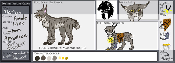 Young Adult: Mara entered a large patch of forest. It seemed magic to her. The trees were large, vines hanging from the treetops, and patches of tall grass softened the ground. Everything was bright, lush and green. She came across a Smilodon saber tooth, Khal, the former leader of Tribe Prathien. Khal welcomed her into the tribe, and after making a traditional formal oath like a chant, Maras armor began to change. The bones of the bears rib cage seemed to harden, and a protection of pearl stone guarded it. Same with the ivory teeth of the bear.