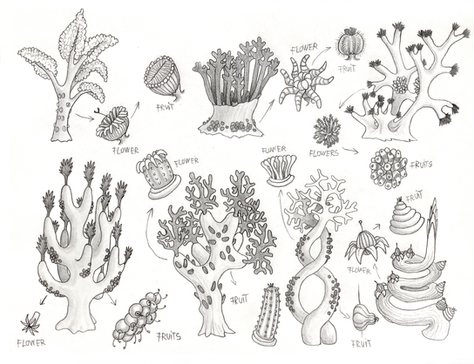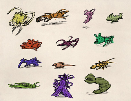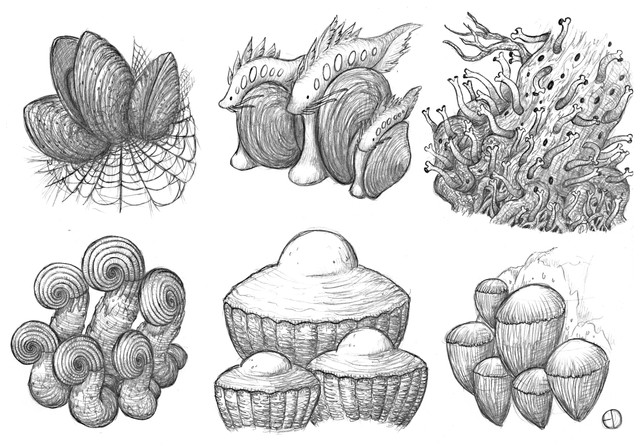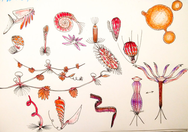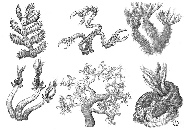 have I told you that I'm a fan of simple lifeforms? Indeed, I am! I always freak out when I read or see something about the ediacarian or cambrian fauna - it's so stunning how these simple animals are already complexe and agile. This compilation was made cause of boreness and perplexity - but the result is something I definately like! All critters are species from one biosphere I've already shown, it's called Bakyrn and is a world at the level of the ordovician era. Here are the first sketches: [link]