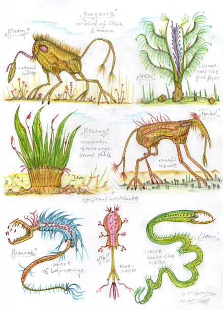 h. Wucherfüßer (extortiopode) - a worm-like animal, the legs are growing without end til it reaches about 10 meters, then the Wucherfüßer splits itself up in 5 to 8 parts (not reproduction!), every part has the same gender, this way to live boosts the chances to survive