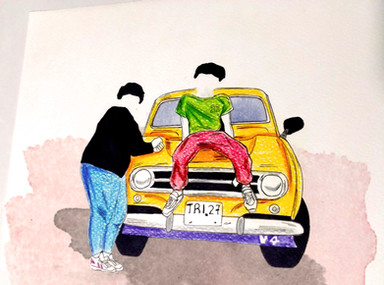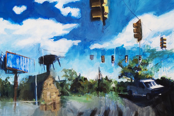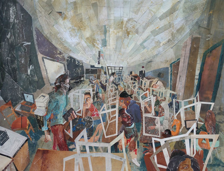 On top of these classic techniques, I brought my skills in collage: disjointed perspective, expressionistic figures, and a bold color palette.
