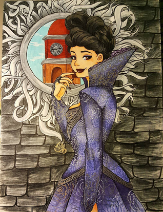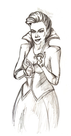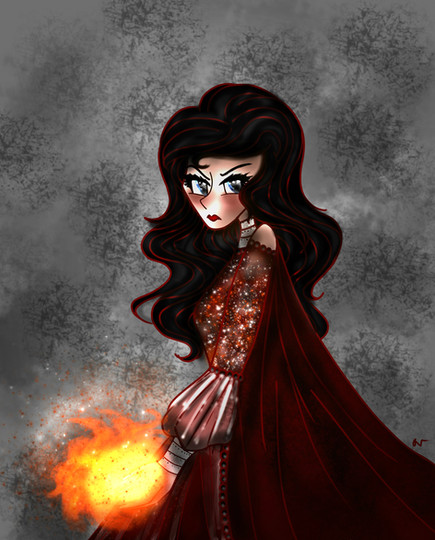 A picture from a screen cap of snow white being all evil >.<(excuse the badly drawn background) >.< Also I had to reset my PC because I was getting ads all over my screen and lost the FireAlpaca file of this drawing, this means I wasn't able to fix the lines on the hair and the light blur on the face >.<