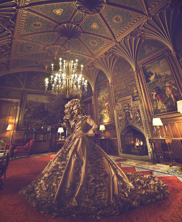 This dress was completed in 5 weeks time, I used mainly curtains and left over fabric, it is embellished with thousands of crystals and pearls and features over 200 feet of pleated ribbon. The wig is 8 inches tall and has a styrofoam core structure inside. So basically itβs just a lot of everything π